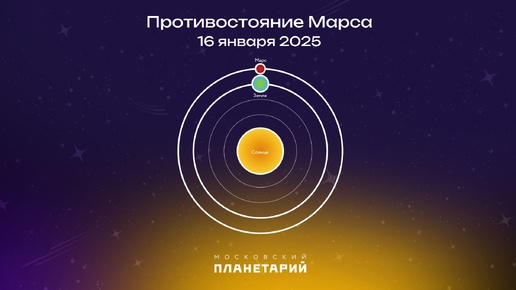 Высоко над южным горизонтом в полночь сияет яркаякрасноватая «звезда» – это планета Марс. Сейчас его блеск равен -1,4m! 16 января 2025 года в 6:00 мск, находясь в 96,3млн км от Земли, он вступит в противостояние с Солнцем. Противостоянием астрономы называют такое расположение небесных тел, когда на одной линии расположились Солнце, Земля и планета (от Марса до Нептуна). Такая ситуация и произойдет 16 января 2025 года, на одной линии окажутся Солнце, Земля и Марс, Земля посередине, а Марс противостоит Солнцу...