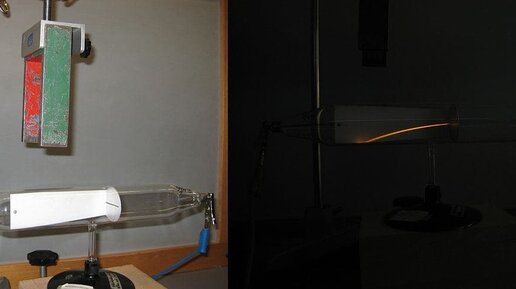 На фото экспериментальная установка для демонстрации силы Лоренца. Левое изображение: как она выглядит Справа: эффект силы Лоренца. Электрон летит с правого конца на левый. Магнитная сила пересекает траекторию полета и отклоняет электронный луч вниз. Так как электрический ток представляет собой упорядоченное движение зарядов, то действие магнитного поля на проводник с током есть результат его действия на отдельные движущиеся заряды. Силу, действующую со стороны магнитного поля на движущиеся в нем заряды, называют силой Лоренца...