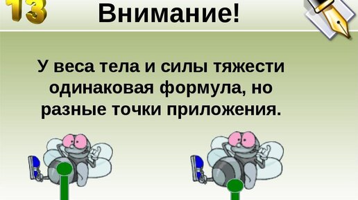 В повседневной жизни мы очень часто используем слово «вес». Мы говорим: вес продуктов, вес нашего тела. При этом зачастую под словом «вес» подразумевается масса тела. В физике используют термины «вес», «масса» и «сила тяжести», и все они обозначают совершенно разные понятия. Давайте рассмотрим тело, подвешенное к динамометру. На само тело действуют сила тяжести и сила упругости пружины. Именно поэтому тело находится в равновесии. Но и растянутая пружина также находится в равновесии, хотя сила упругости, возникающая в ней, стремится вернуть её в первоначальное состояние...