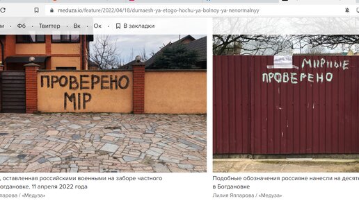 У "Медузы" (иноагент - приписка важна в контексте сообщения) вышел текст про Богдановку. Рассказ о том, как российские военные там якобы убили мужа и изнасиловали жену. Начинается текст с фото. Когда в тексте о чудовищнейших военных преступлениях в издании из страны НАТО журналист, уехавший в страну НАТО, допускает такие иллюстрации, остальному верить не получается. В тексте речь идет о том, что зашедшие в село российские военные якобы проверяли каждый дом и потом делали такие метки. Российские военные...