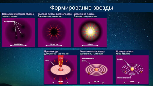 Формирование звезды (образование звезды) — начальная стадия эволюции звёзд, при которой межзвёздное облако превращается в звезду. При этом процессе облако сжимается и фрагментируется, оказывается непрозрачным для собственного излучения и становится протозвездой. На этой стадии на протозвезду аккрецирует вещество внешних частей облака, а когда аккреция завершается, оно становится звездой до главной последовательности, излучающей за счёт собственного сжатия. Постепенно в ядре звезды начинаются термоядерные...