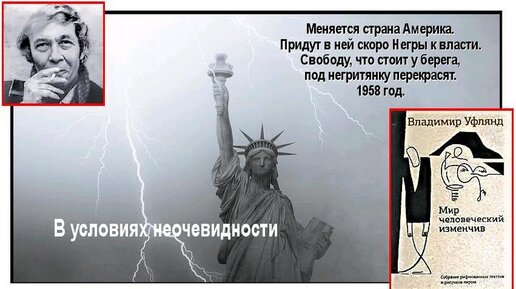 Вот, что подвигло юного Владимира Уфлянда, в возрасте 21 года, в далеком 1958-м написать стихотворение "Меняется ли Америка?", сознательно или неосознанно подметив в окружающих реалиях проекцию на события далекого будущего?