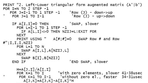 ...................................................."Даром дадено, даром давайте", - Исус Христос. В предыдущей статье [1] был описан простейший способ решения систем линейных алгебраических уравнений (СЛАУ) методом Гаусса с приведением матрицы коэффициентов к традиционному правому верхнему (Right-Upper) треугольному виду (частному случаю ступенчатого вида), взятый из справочника Дьяконова [2]. Метод Гаусса требует O(n^3) арифметических операций [3]. Недостатками традиционного способа являются: 1...