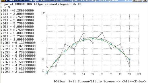 ....................."Вершины понизятся, а низины повысятся", - Исус Христос. Сглаживание по пяти точкам является свёрткой (конволюцией) исходных числовых данных с пятичленным многочленом (полиномом), называемым окном [5]. Окно задаётся формулой и пятью весовыми коэффициентами. Линейное (простое среднее (арифметическое), медианное) и нелинейное сглаживание производятся по одним и тем же формулам и алгоритмам, меняются только весовые коэффициенты в сглаживающем окне (операторе [8]). При линейном сглаживании все весовые коэфффициенты в сглаживающем окне равны и сглаживающее окно прямоугольное...