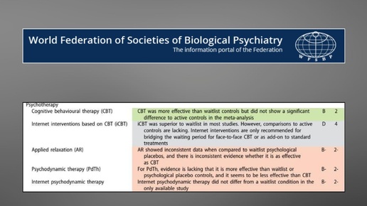 Эффективность КПТ: научный подход Когнитивно-поведенческая терапия (КПТ) — ведущий метод психотерапии с доказанной эффективностью. Рассмотрим данные WFSBP (2022) Категории доказательности WFSBP: A: абсолютные доказательства из контролируемых исследований B: ограниченные положительные доказательства из контролируемых исследований C1: неконтролируемые исследования или мнение экспертов C2: описание случаев C3: мнения экспертов или клинический опыт D: противоречивые результаты исследований E: отрицательные...