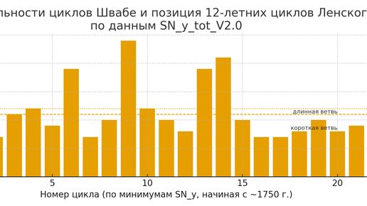 Аннотация Работа посвящена анализу структуры цикличности солнечной активности в диапазоне десятилетий на основе ежегодного ряда числа солнечных пятен SN_y_tot_V2.0 (SILSO). Показано, что привычный «11-летний цикл» Швабе представляет собой усреднённую характеристику процесса с выраженной двухрежимной структурой длительностей, включающей «короткую» и «длинную» ветви. На этой основе вводится эффективный 12-летний такт, далее называемый «циклом Ленского» (по имени автора концепции Василия Ленского), и рассматриваются 72-летние блоки как последовательности из шести циклов Швабе...