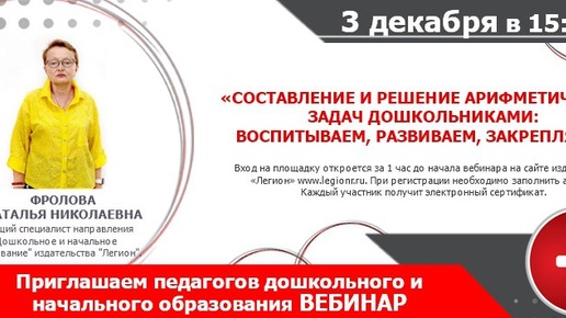 Вебинар "Составление и решение арифметических задач дошкольниками: воспитываем, развиваем, закрепляем" Дата: 03.12.2025 (Ср) Время: 15:00 Лектор Фролова Наталья Николаевна - ведущий специалист направления "Дошкольное и начальное образование" издательства "Легион"...