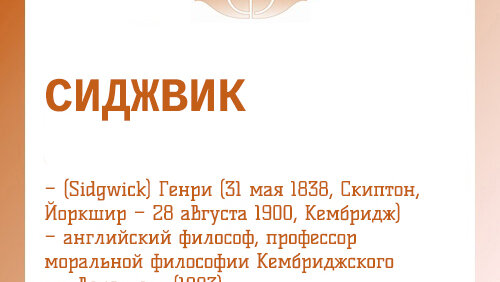 СИДЖВИК (Sidgwick) Генри (31 мая 1838, Скиптон, Йоркшир – 28 августа 1900, Кембридж) – английский философ, профессор моральной философии Кембриджского университета (1883). Получил образование в Кембридже, где преподавал сначала классическую филологию, затем философию, этику, политическую экономию, право. Владел несколькими иностранными языками, в т.ч. арабским и древнееврейским. Один из основателей и первый президент Общества психологического исследования (1882). С начала издания журнала «Mind» (1876) был его постоянным автором и спонсором...