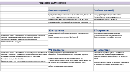 SWOT-анализ - это комплекс маркетинговых и других исследований для оценки внешних и внутренних факторов, которые влияют на развитие компании. Расшифровка SWOT-анализа: S - Strengths (сильные стороны), W - Weaknesses (слабые стороны), O - Opportunities (возможности), T - Threats (угрозы). Но мало источников, которые рассказывают, что данный анализ высчитывается из ряда других анализов: Итоги SWOT-анализа позволяют выявить сильные и слабые стороны заказчика, выявить возможности и риски его компании...