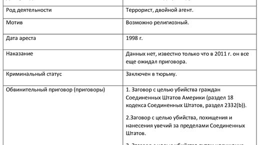 Биографическая таблица: Краткие факты: Али Абдул Сауд Мохаммед родился 3 июня 1952 года. Данный человек является двойным агентом, который работал одновременно как на Центральное разведывательное управление США, так и на Египетский исламский джихад, сообщая о работе каждого в интересах другого. Он приехал в Соединенные Штаты, работая переводчиком у Аймана аль-Завахири, который посетил Калифорнию в 1993 году после взрыва во Всемирном торговом центре, надеясь собрать деньги для «Аль-Джихада»...