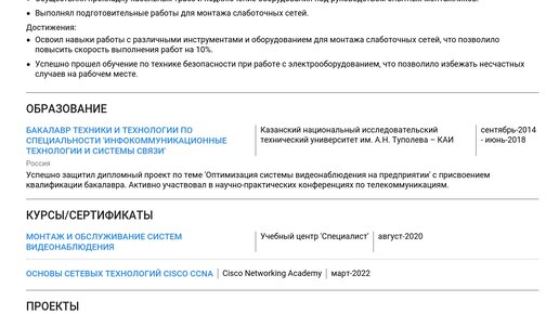 Наш пример резюме монтажника слаботочных сетей поможет вам составить документ, который выделит вас среди кандидатов. Изучение готовых примеров — лучший способ понять, как создать эффективное резюме для получения желаемой работы. На этой странице вы найдете все для создания сильного резюме монтажника слаботочных сетей. Здесь представлены . Материал полезен для новичков и опытных специалистов, помогая понять, как составить эффективное резюме. ✅ Изучив пример, вы сможете создать резюме с помощью нашего конструктора резюме...