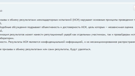 https://rosakkreditatsiya-forum.ru/viewtopic.php?f=11&t=1804 Закрываем тему "Результаты МСИ" навсегда Причина: Обсуждение и призывы к обмену результатами межладарторных испытаний (МСИ) нарушают основные принципы проведения таких сличительных исследований. Компрометация процесса. Подобные обсуждения подрывают объективность и достоверность МСИ, цель которых — независимая оценка компетентности лабораторий...