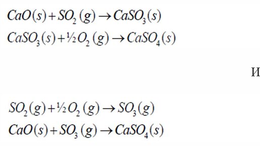 Сульфатирование CaO с SO2 было признано сложным, высокотемпературным, кратковременным гетерогенным процессом, ограниченным газофазной и твердофазной диффузией, с одновременным физическим преобразованием твердого вещества. Процесс сульфатирования может протекать по нескольким путям, и в литературе отсутствует согласие относительно механизма. Было определено два возможных пути сульфатирования: через образование CaSO3 или через превращение SO2 в SO3, который непосредственно реагирует с CaO с образованием CaSO4...