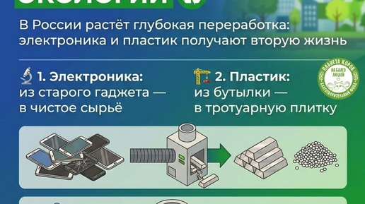 ♻️ В России растёт глубокая переработка: электроника и пластик получают вторую жизнь Рынок вторсырья уходит от простой сортировки к созданию новых промышленных продуктов. В разных регионах открываются заводы, которые перерабатывают даже самые сложные отходы, создавая реальную экономику замкнутого цикла. 🔬 1. Электроника: из старого гаджета — в чистое сырьё В Подмосковье заработал высокотехнологичный завод «Рус-Экотех» по переработке электроники. На автоматизированной линии разбирают старые компьютеры, телефоны и бытовую технику...