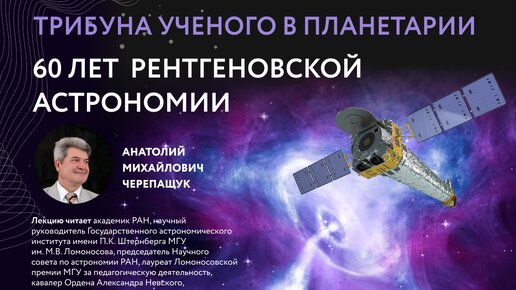 25 ноября 2022 года в 19.00 в конференц-зале Московского Планетария состоится лекция на тему «60 лет рентгеновской астрономии». Ведущий – Анатолий Михайлович Черепащук, академик РАН, председатель Научного совета по астрономии РАН, научный руководитель Государственного астрономического института имени П.К. Штернберга МГУ им. М.В. Ломоносова, лауреат Ломоносовской премии МГУ за педагогическую деятельность, кавалер Ордена Александра Невского, заместитель председателя Ученого совета Московского Планетария...