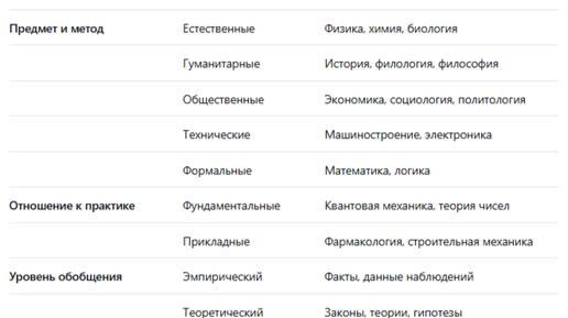 Это деление на большие группы наук в зависимости от того, что изучается (предмет) и как изучается (метод). Естественные науки: Изучают природу и законы её развития. Гуманитарные науки: Изучают человека, его духовную, культурную и общественную деятельность. Общественные (социальные) науки: Изучают общество, его структуры, закономерности и функционирование. Часто объединяют с гуманитарными, но есть различие в акцентах (общественные науки стремятся к выявлению объективных закономерностей). Технические...