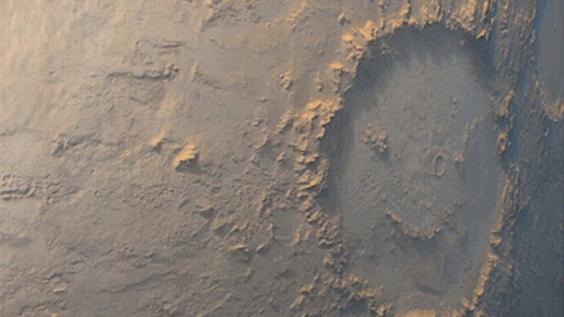 Знаменитый марсианский кратер Галле прославился благодаря своим внутренним структурам, которые создают поразительное сходство с лицом - одновременно улыбающимся и подмигивающим. Это необычное "лицо" было впервые замечено в 1970-х годах на снимках космического аппарата "Викинг". Спустя десятилетия, когда автоматическая станция Mars Global Surveyor (работавшая на орбите Марса с 1996 по 2006 год) сделала детальное изображение этого кратера, загадочный "портрет" предстал перед нами во всей своей красе...