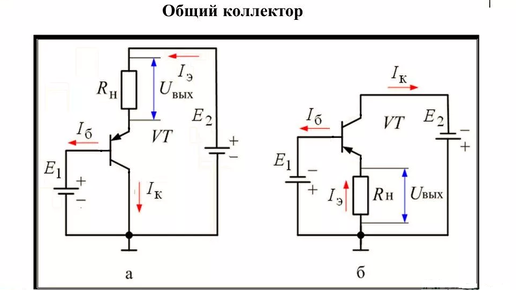 Включение транзистора по схеме общий коллектор. Если посмотреть схему данного вида. Видим, что коллектор и база подключены вместе (рисунок а)). И понятно как распределяются токи. Но есть нюансы, В силу конструктивности транзистора и работы схемы, понимаем, что входное сопротивления закрытого перехода имеет большое значение. Значит основное сопротивление на входе будет зависеть от сопротивления нагрузки. Если рассмотреть рисунок б), то мы реконструировали схему - переместили опорную точку (ноля) и перерисовали в другом виде...