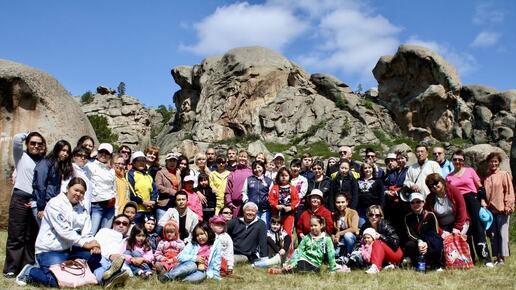 Бұл суретте Алматы мен Астанадан Қарағанды облысы, Қарқаралыдағы "Тас бұлақ" демалыс үйіне демалуға келген туристердің үлкен тобымен бірге Кент тауларына барған кезім. Ол жер өте ерекше, өйткені табиғат па немесе басқа да бір тылсым күш па үлкен алып тастарды жинап көптеген фигуралар жасап қойғандай. Онда әр 5-10 метр сайын биіктігі 50-70 метр болатын фигуралар бар, олар монахқа, кин-конгқа, тасбақаға, қасқырға, дельфинге ұқсайтын фигуралар… Өте әдемі және ғажапқа толы аймақ – Қарқаралыдағы Кент таулары...