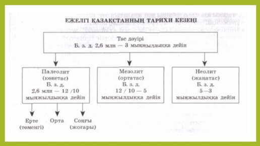 Ежелгі дәуір тарихының алғашқы даму кезеңі - Тас дәуірі. Тас дәуірі өз ішінде - Палеолит, Мезолит, Неолит және Өтпелі кезең - Энеолиттен тұрады. Әрбір кезең өз ішінде бірнеше бөліктерге бөлінеді. Әсіресе, кезеңге бөлу - Палеолит кезеңіне тән. Қазақстандық тарихшылар арасында Палеолит кезеңінде - кіші кезеңдерге бөлуді екі түрлі көзқарас қалыптасқан. Бір тарап оны екіге бөледі 1. Ерте Палеолит Б.з.б. 2,6/2,5 млн ж.ш. - б.з.б 40/35 мың ж. 2. Кейінгі Палеолит Б.з.б. 40/35 мың ж. - б.з.б 12/10 мың ж...