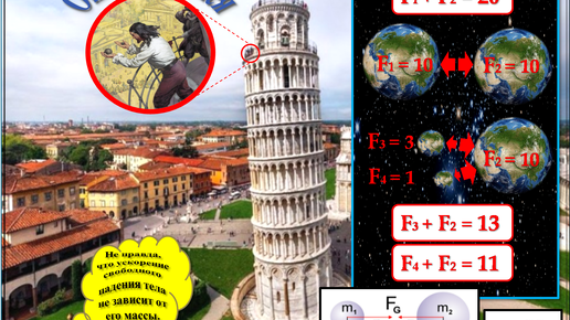 Здесь условно опровергается еще одна общеупотребительная идея, которая принадлежит Галилею, и которая без особой критики воспроизводится в учебниках и энциклопедиях по всему миру - с тех пор, как этот знаменитый ученый продемонстрировал эксперимент, запечатленный на моем рисунке. Источники свидетельствуют, что якобы он сбросил с верхнего этажа Пизанской башни два шарика одинакового размера (чугунный и деревянный), и убедился, что они коснулись земли одновременно. На основании вышеописанного эксперимента...