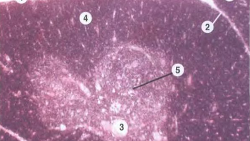 Тимус, как и красный костный мозг, относится к центральным органам кроветворения. В нём происходят заключительные стадии антигеннезависимого созревания Т-лимфоцитов. а) малое увеличение: 1. Капсула тимуса: образована плотной волокнистой соединительной тканью; 2. Отходящие от капсулы соединительнотканные перегородки; 3. Дольки тимуса (разделенные перегородками). В кажной дольке: 4. Корковое вещество лежит на периферии и является более темным (густо заселено лимфоцитами); 5. Мозговое вещество в центре дольки и более светлое...