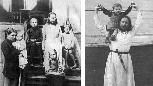 Священник Павел Флоренский с семьей (жена Анна с сыном Микой, Вася, Кира и Ольга), г. Сергиев Посад, 1928 г. Фото: ИТАР-ТАСС. Фото справа: https://img.libnvkz.ru/