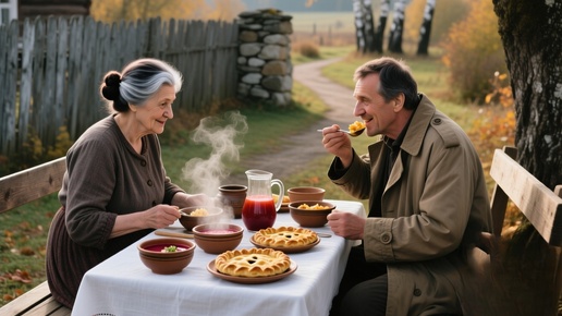 Валентина готовила обеды. Они ели во дворе, под яблоней, на лавочке. Стол накрывала прямо там — скатерть стелила, посуду выносила. Борщ, пироги, компот. Виктор ел с аппетитом, нахваливал: — Такого борща я давно не ел, Валентина Сергеевна! У вас талант настоящий. Разговаривали о простом. О погоде: дожди пойдут или ещё подержатся сухо? О соседях: кто что делает, кто куда собирается. О том, что показывают по телевизору — новости, сериалы, политика. Виктор не лез в душу, не задавал лишних вопросов, не торопил события...