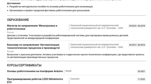 Хороший пример резюме преподавателя робототехники — ключ к пониманию того, как представить свой опыт и навыки наилучшим образом. Изучение готовых кейсов поможет вам составить по-настоящему эффективное резюме, увеличив шансы получить желаемую работу 💡. На этой странице мы собрали готовые примеры, которые подойдут как начинающим, так и опытным специалистам в области преподавания робототехники. Вы найдете подробные пошаговые инструкции по каждому разделу, где мы рассматриваем . Изучив пример, вы сможете создать резюме с помощью нашего конструктора резюме...