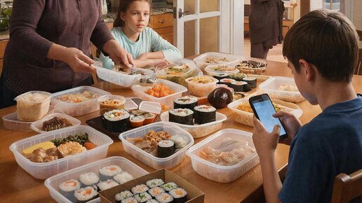 -Приготовь стол на 8 человек, к нам едет родня.Муж сообщил об этом за 1 час до прихода гостей. Я заказала суши и ушла смотреть сериал.