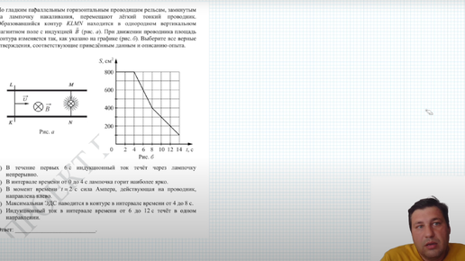 В этом видео ролике представлен разбор четырнадцатого задания демо-версии ЕГЭ по физике 2024. Условие задачи: "По гладким параллельным горизонтальным проводящим рельсам, замкнутым на лампочку накаливания, перемещают лёгкий тонкий проводник. Образовавшийся контур KLMN находится в однородном вертикальном магнитном поле с индукцией B (рис. а). При движении проводника площадь контура изменяется так, как указано на графике (рис. б). Выберите все верные утверждения, соответствующие приведённым данным и описанию опыта...