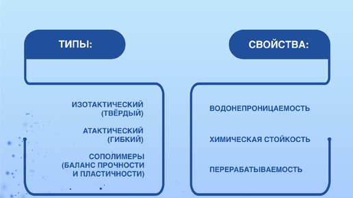 Итак, что получится, если добавить к нефти C₃H₆? Ответ – полипропилен. Этот материал формируется полимеризацией пропилена с использованием катализаторов, в результате чего отдельные молекулы соединяются в длинные цепи. Структура молекул определяет свойства полимера: изотактический полипропилен отличается высокой прочностью, твердостью и термостойкостью, атактический – гибкий и каучукоподобный, а сополимеры объединяют качества обоих типов, создавая баланс между жесткостью и пластичностью. Полипропилен...
