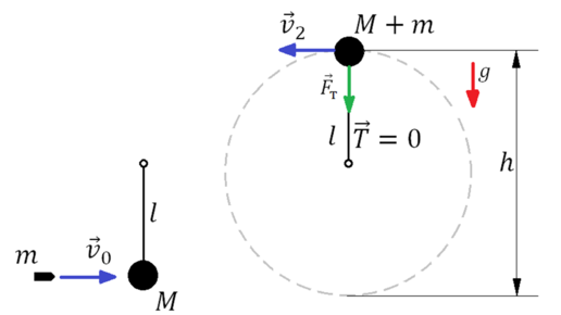 Полное условие задачи: В маленький шар массой M = 250 г, висящий на нити длиной l = 50 см, попадает и застревает в нём горизонтально летящая пуля массой m = 10 г. При какой минимальной скорости пули шар после этого совершит полный оборот в вертикальной плоскости? Сопротивлением воздуха пренебречь. Краткое условие задачи: Решение задачи: Взаимодействие пули и шара опишем используя закон сохранения импульса системы тел. Движение шара с застрявшей в нём пулей опишем законом сохранения энергии. Условие...