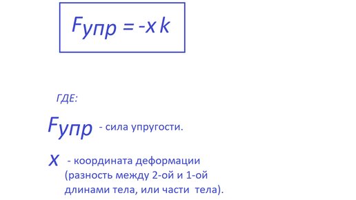 Физики утверждают, что если юридические законы могут быть нарушены или отменены, законы природы не может нарушить или отменить никто, мол (хотя лучше быть готовым ко всему, наверно, а может - есть Бог). Итак, закон Гука: При упругих деформациях, сила упругости тела, или части тела F упр , равна произведению величины координаты деформации x на жёсткость этого тела, или части тела k, и сила упругости F упр направлена в сторону противоположную деформации. Под понятием координата деформации x может иметься ввиду разность длин (не только по прямой линии)...
