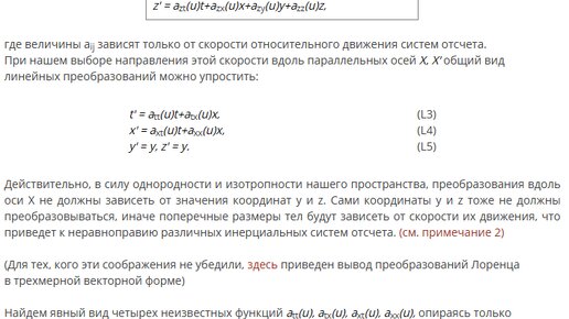 Источником информации по выводу преобразований Лоренца послужила публикация Физического факультета СПбГУ «Вывод преобразований Лоренца из принципа относительности». Приведу основные соотношения прямо с этого материала Здесь, как и у Эйнштейна, сделано важное допущение (или упущение). Время встречного движения и расстояние встречного движения априори приравнено к времени и расстоянию прямого движения. Если исходят из предположения, что переворот векторов ничего не изменит, то это тождественное преобразование и не может использоваться как средство для решения системы уравнений...