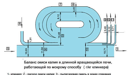 В зоне горения KCl и NaCl в виде соединений хлора испаряются из сульфатного расплава. Коэффициент испарения хлора находится в диапазоне от 0,900 до 0,996, и он испаряется почти на 100%. Температуры кипения KCl и NaCl составляют приблизительно 1400 C при 1 атм. Циркуляция определяется фазовым равновесием между жидким и газообразным KCl. Хлорид имеет значительную циркуляцию вокруг кальцинатора, что приводит к высокой концентрации хлора. В качестве приближения массовый расход хлора на входе в печь в 200 раз превышает массовый расход выгружаемого хлора на выходе...