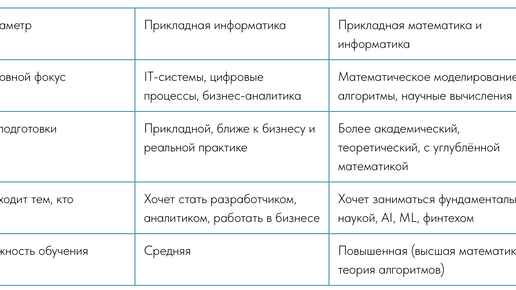 С первого взгляда — разница лишь в названии, но на деле программы сильно отличаются. Разбираемся, что ближе именно тебе, где легче учиться и какие перспективы ждут после выпуска. Прикладная информатика: Прикладная математика и информатика: После прикладной информатики: После прикладной математики...
