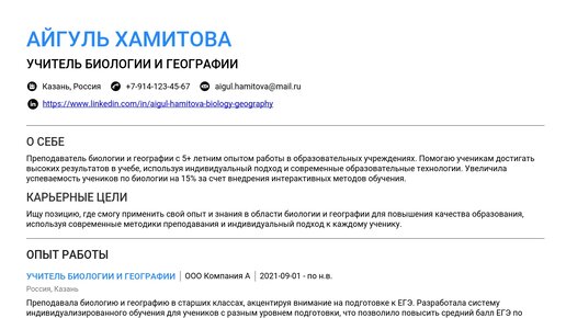 Пример резюме учителя биологии и географии 2025 - Как составить