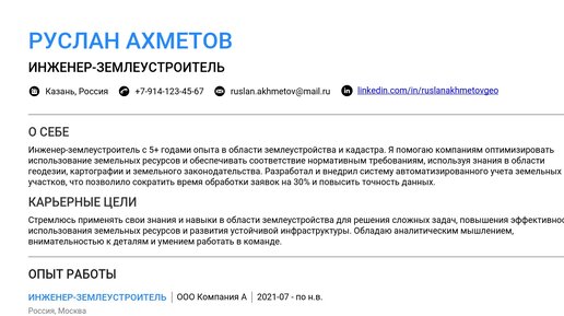 Пример резюме инженера-землеустроителя 2025 - руководство