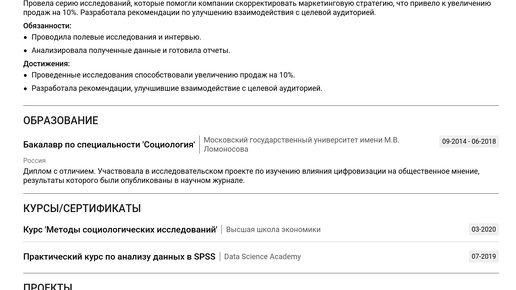 Пример резюме социолога поможет вам увидеть, как правильно представить свой опыт и навыки. Изучив готовые примеры, вы сможете составить эффективное резюме, которое выделит вас среди кандидатов и приблизит к получению желаемой работы. ⭐ На этой странице вы найдете готовые примеры резюме социолога для специалистов разного уровня – от начинающих до опытных, а также пошаговые инструкции по каждому разделу, чтобы учесть требования работодателей и актуальные навыки. Мы покажем, как правильно заполнить...