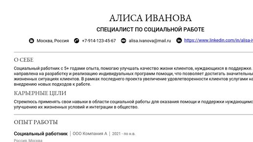 Пример резюме социального работника перед вами, и он покажет, как составить по-настоящему эффективное резюме. Используйте готовые примеры, чтобы значительно повысить свои шансы получить желаемую работу. Изучив эту статью, вы получите полное представление о том, как составить резюме социального работника, соответствующее требованиям работодателей. Мы предлагаем готовые примеры как для начинающих, так и для опытных специалистов, а также подробные пошаговые инструкции по каждому разделу документа. Уделим внимание актуальным навыкам и советам по адаптации резюме под конкретные вакансии...