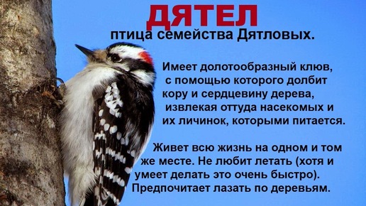 ШкоЛаЛа4 года назадПодписатьсяШкольный мини проект по биологии про Дятла(отряд птиц к которому принадлежит, место обитания, питание, особенности приспособления к среде обитания)