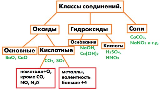 г) несолеобразующие оксиды (запомнить, в схеме так же их нет) - CO, SiO, N2O, NO, NO2...