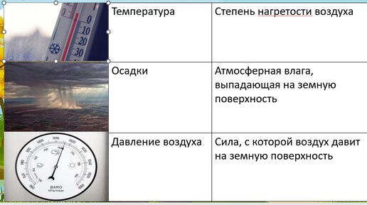 Климат многолетний режим погоды, характерный для данной территории. Климат более постоянен, чем погода, он остаётся неизменным в течение долгого времени. Представление о климате складывается из многолетних наблюдений за погодой. В разных районах Земли неодинаковы средние температуры и атмосферное давление, выпадает разное количество осадков. Количественные и качественные характеристики климата (средние температуры января и июля, среднегодовое количество осадков, направление преобладающих ветров и др...