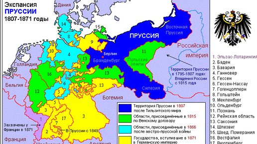 Экономика. В 1850-60-х промышленный переворот в Германии достиг определённого успеха. Объем продукции вырос вдвое по сравнению с началом 1850-х. К концу 1860-х было уже более миллиона промышленных рабочих. Массово возникали новые предприятия. Рейнская область, Саксония, Берлин, Силезия – главные промышленные центры. К 1870 г. общая мощность немецких паровых машин составила 2,48 млн л.с., - данный показатель был намного выше французского. К 1870 г. в Пруссии было 11523 км ж/д. Развивалась внутренняя и внешняя торговля...