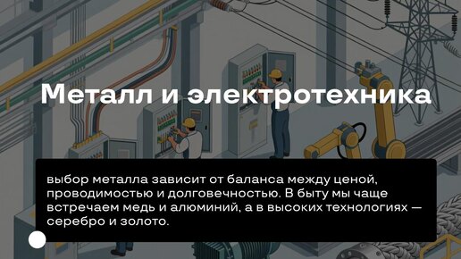 В электротехнике металл играет ключевую роль — именно он проводит ток. Но разные металлы ведут себя по-разному, и от этого зависит, где их используют 1.Медь Самый популярный проводник. Отличается проводимостью, гибкостью и долговечностью -Применение: кабели, обмотки трансформаторов 2.Алюминий Легче меди и дешевле, но хуже проводит ток и быстрее окисляется -Применение: линии электропередач, воздушные провода, кабели в строительстве 3.Золото Очень дорогой, но надёжный проводник — не окисляется и работает десятилетиями - Применение: микроэлектроника, контакты в смартфонах и компьютерах 4...