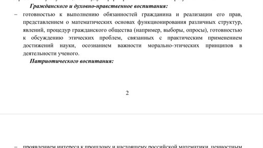 Рассмотрим рабочую программу по математике. Среди прочего там предлагаются планируемые личностные результаты освоения учебного предмета "Математика". В таких программах обычно много бюрократического языка, ими мало кто руководствуется в ежедневном преподавании, но они есть. На первом месте стоит гражданское и духовно-нравственное воспитание. Тут и математическое понимание опросов, выборов, и этика учёного. Этот компонент довольно сложно включить в урок, измерить, отследить. Эти вещи куются в труде в семье и обществе...