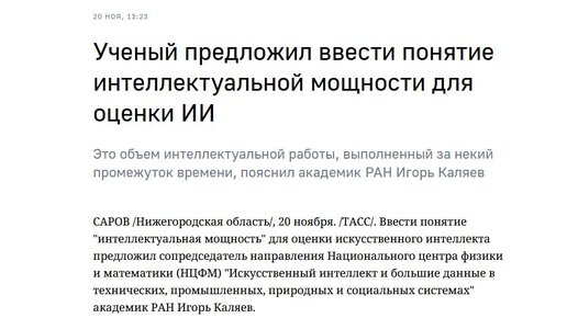 Удивила "новость", опубликованная главным информационным агентством страны. Доктор технических наук академик РАН Игорь Каляев выступил с предложением ввести понятие "интеллектуальная мощность" для оценки "ИИ". "Логично предположить, что сила интеллекта системы зависит от ее способности выполнять некую интеллектуальную работу за ограниченный промежуток времени. <…> Предлагаю ввести понятие интеллектуальной мощности — это объем интеллектуальной работы, выполненный за некий промежуток времени", — сказал Каляев...