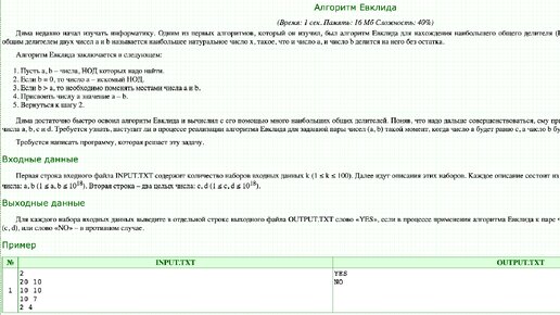 А теперь к настоящим алгоритмам, а не использованию уже написанных в стандартной библиотеке. Читаем условие задачи: Алгоритм Евклида - это, действительно, эффективный способ вычисления наибольшего общего делителя двух чисел. Но та версия, которую изучил Дима из условия задачи является неоптимальной. Давайте посмотрим на примере. Если даны два числа 1000000 и 12, то шаг 4 будет выполняться очень много раз (83333), после чего a будет равно 4, а b - 12 (затем, они, конечно, поменяются местами). На примере мы можем заметить, что 1000000 = 83333 * 12 + 4, или в общем виде a = k * b + r...