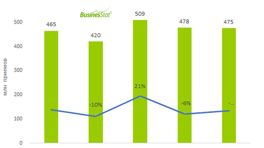 В 2019-2023 гг объем рынка педиатрии в России увеличился на 2%: с 465 до 475 млн приемов.